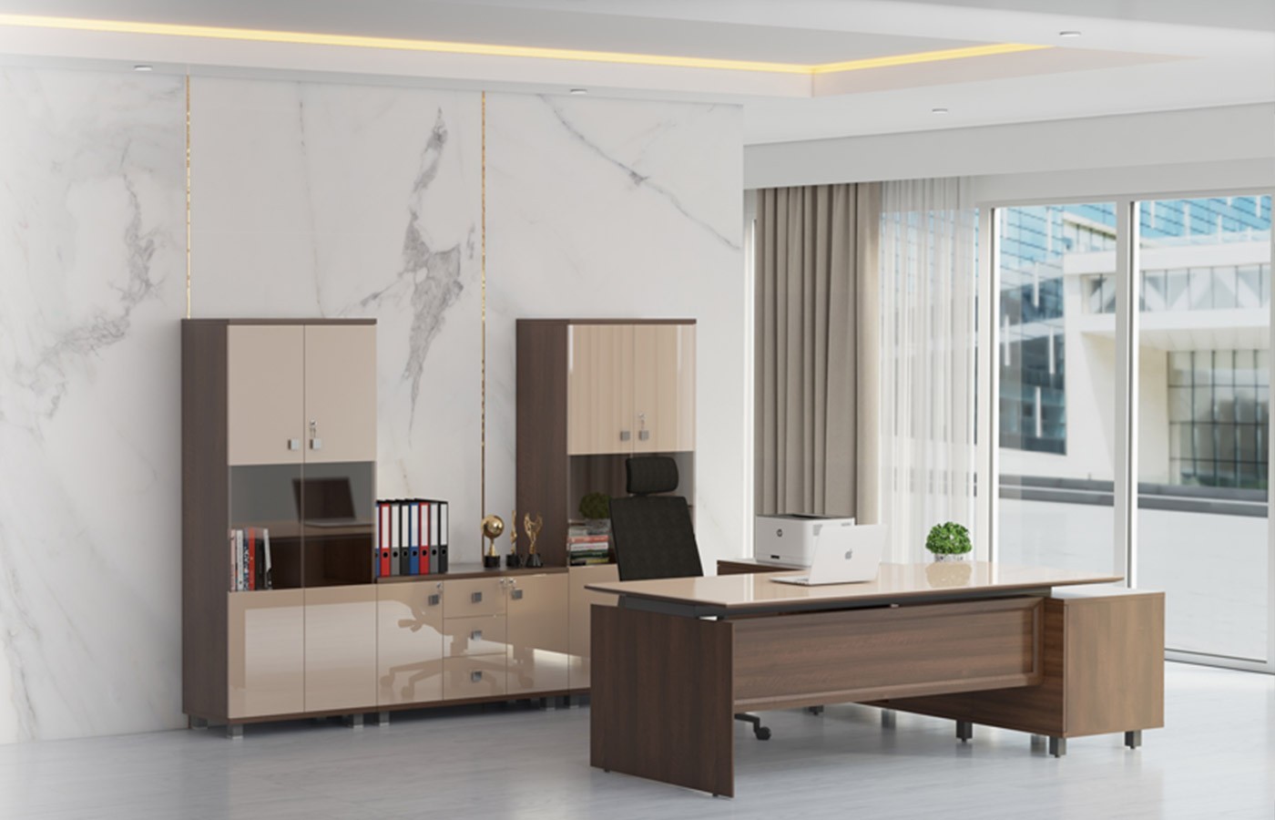 Chief presents itself in an exquisite Glass and Membrane finish, creating a visually captivating centerpiece which elevates the ambiance of any workspace it graces.
