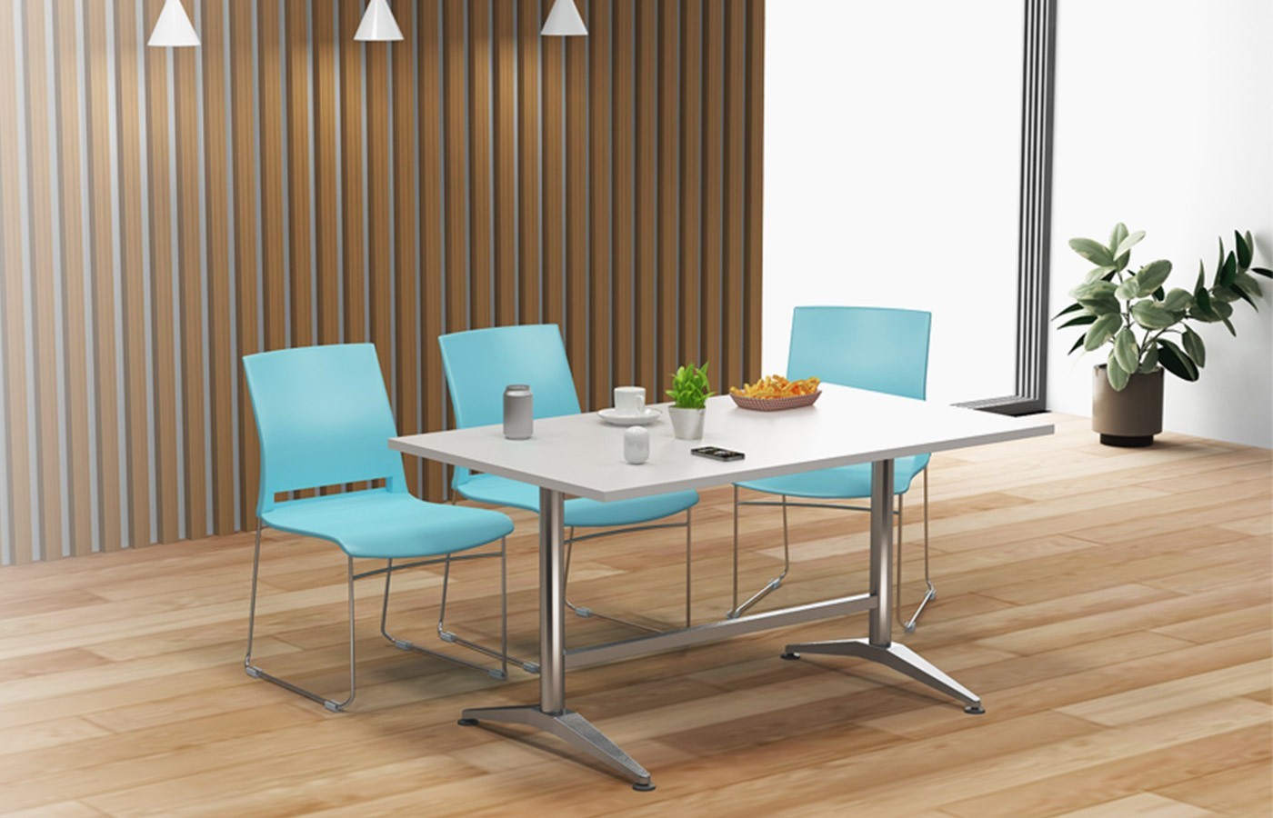 Luncheon Compact tables extend the same choice of finishes for tabletop and understructure as Luncheon Regular, with a more streamlined design.
