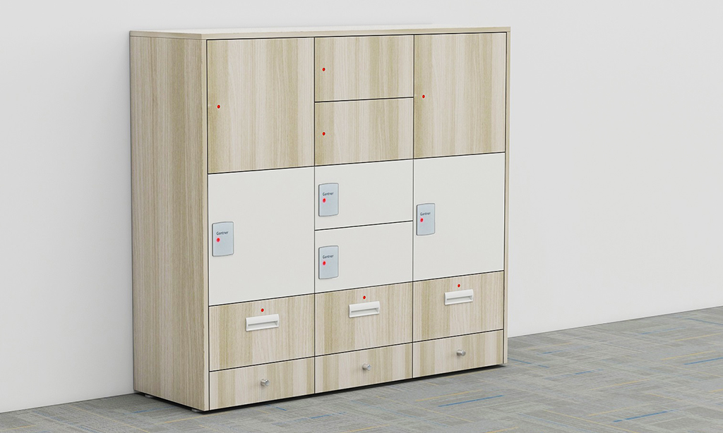 The locker housing is available in metal and wooden finishes, allowing for customization to match the desired aesthetic of the workspace.