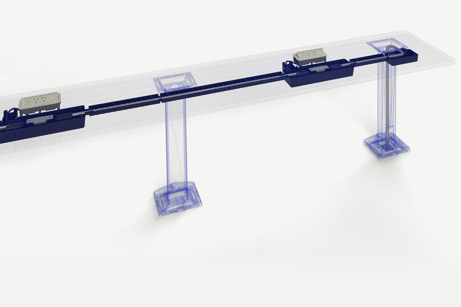 • Permanently mounted pedestal legs support continuous worksurfaces arranged in straight, curved or angled configurations