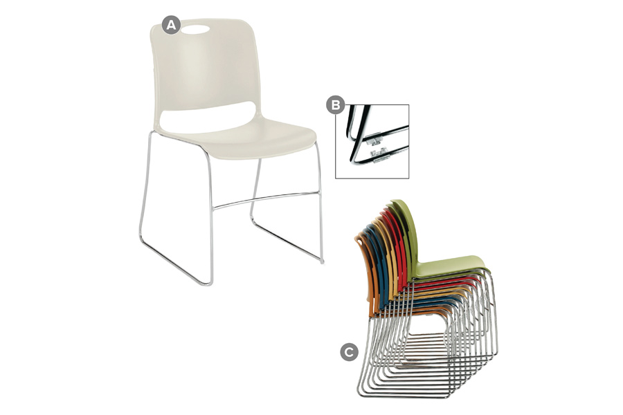 Chairs stack 10-high on floor and 38-high on dolly. Dolly can be ordered separately for ease of transport and storage.